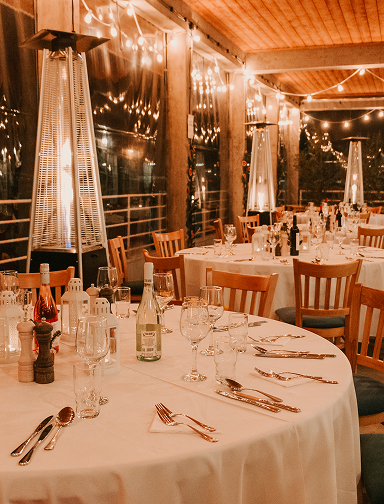 Zadaszone tarasy dla 150 osób w razie deszczu.